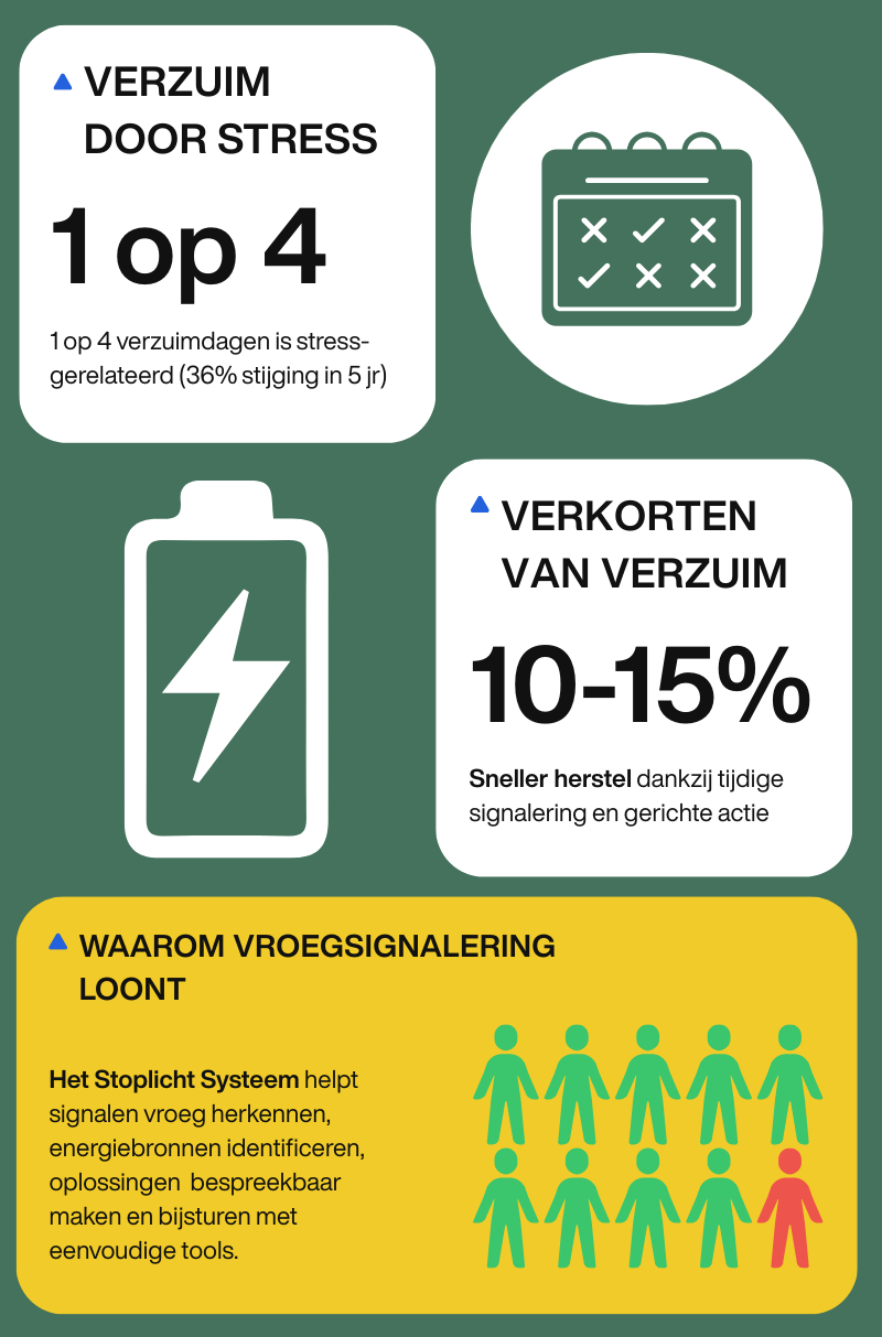Het Stoplicht Systeem maakt stress bespreekbaar, versterkt energiebronnen en helpt teams tijdig bijsturen met praktische tools. Zo groeit duurzame inzetbaarheid vanzelf.